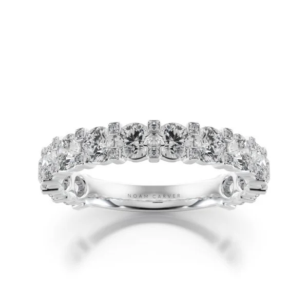 The three-quarter eternity style provides generous sparkle across the front of the band while allowing for a more comfortable and practical fit. Smooth bezels secure each stone and create a refined silhouette that rests gracefully against the finger.