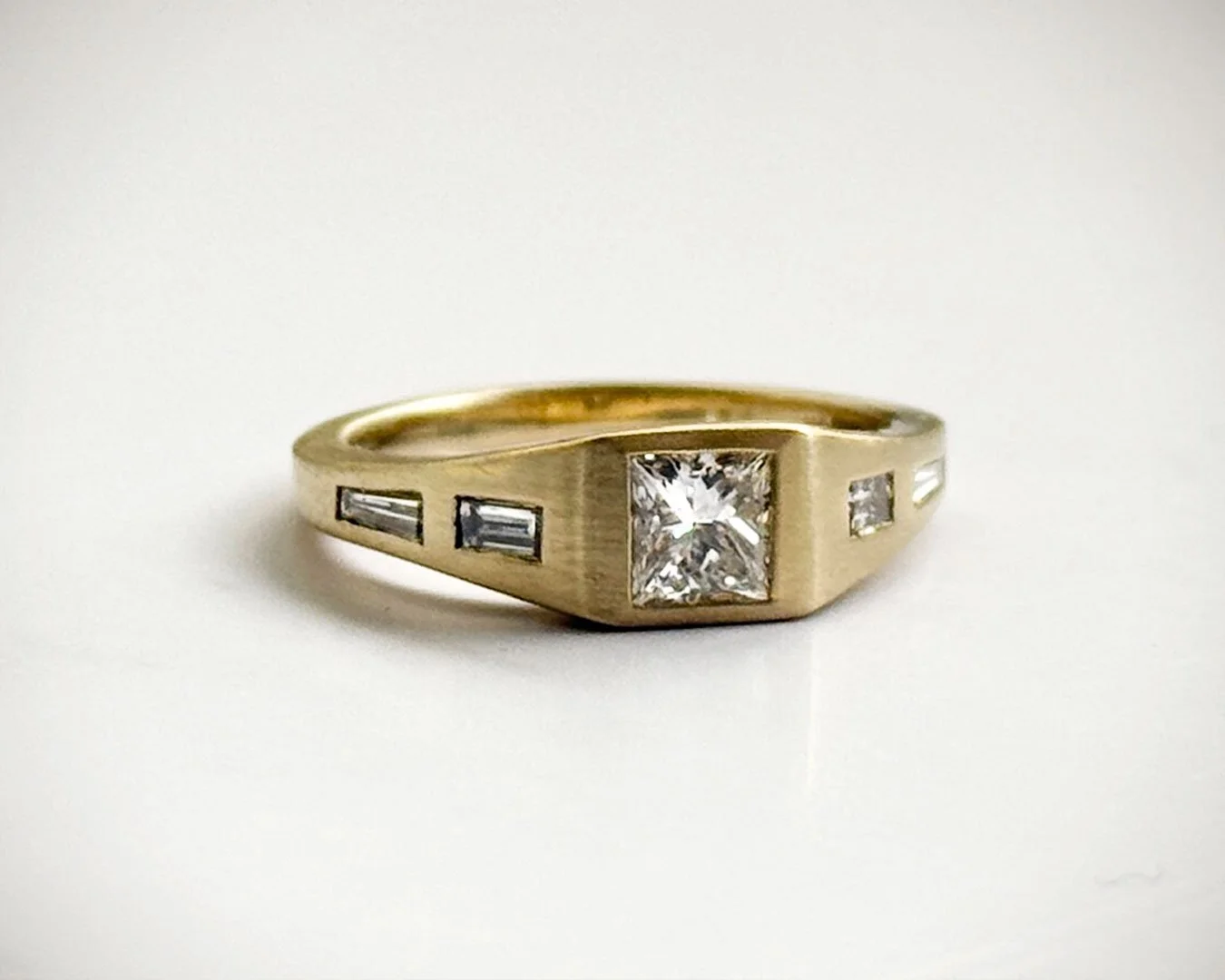 The client’s treasured rings featured an array of beautiful diamonds, including a striking large square-cut diamond, two baguette diamonds, and two tapered baguette stones. We transformed these gems into a one-of-a-kind signet ring, expertly crafted in brushed 14k yellow gold. The diamonds were carefully gypsy set, resulting in a sleek and contemporary aesthetic that beautifully showcases both the stones and the design.
